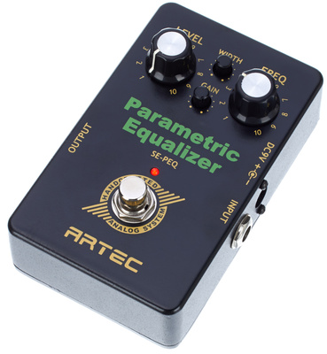 De Artec Parametric EQ kan dit allemaal voor heel weinig geld. De besturingselementen zijn FREQ/WIDTH/GAIN/LEVEL. Het pedaal heeft een True Bypass en kan worden gevoed met een 9-volt batterij of voeding (beide optioneel verkrijgbaar). De behuizing is van gegoten zink en de afmetingen zijn (BxDxH): 75,5 x 116 x 49 mm. Het gewicht is 340 gram.