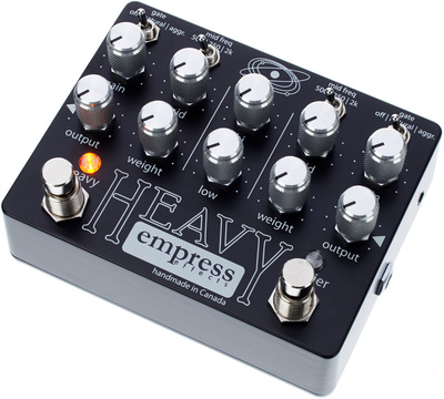 Het Empress Effects Heavy effectpedaal voor elektrische gitaren biedt twee kanalen met apart instelbare gain, output, gewicht en semi-parametrische mids. Elk kanaal heeft ook hi en low controls en een noise gate met twee modes. Het pedaal heeft een gesloten aluminium behuizing en vereist een 9-12V DC voeding (niet inbegrepen). Het heeft een power consumption van 200 mA en weegt ongeveer 500 g. Een bijpassende voeding is beschikbaar maar niet inbegrepen.