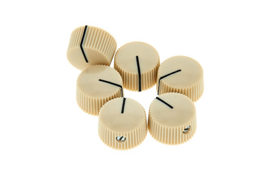 De Fender Poti Vintage White is een set van 6 witte vintage knoppen die geschikt zijn voor gebruik op bijvoorbeeld de Bassmann Blonde.
