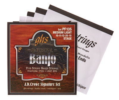 De GHS PF135 JD Crowe Banjo Set is een set van 5 roestvrij stalen snaren voor banjo met de signature van Crowe. De snaren hebben een loop end en zijn verkrijgbaar in sterktes van 010-011-012-020-010.