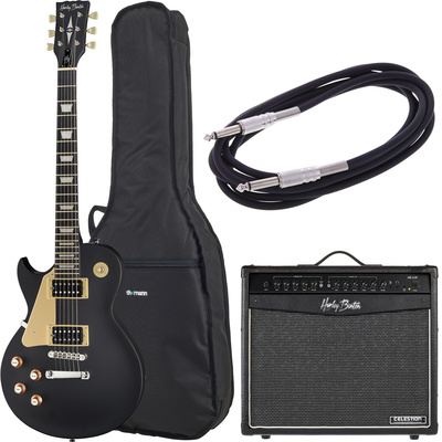 De Harley Benton SC-400LH SBK Classic Se Bundle is een pakket bestaande uit een linkshandige elektrische gitaar, een 65 watt comboversterker met 2 kanalen en een 12″ Celestion luidspreker, een gigbag en een instrumentenkabel. De gitaar heeft een lindehouten body, een geschroefde esdoorn hals en 2 Classic Open Humbuckers. De versterker heeft een reverb, een effectloop en een koptelefoonuitgang. De set is geschikt voor beginners en gevorderden en heeft een zwarte matte afwerking. Een footswitch is niet inbegrepen.