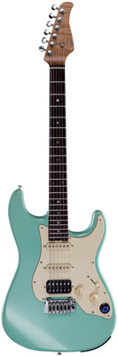 De Mooer GTRS Guitars Prof. 800 MG is een elektrische gitaar die klassieke elementen combineert met moderne technologieën voor digitaal sound design. Het geïntegreerde GTRS System biedt tone modeling, selecteerbare presets, meerdere output-opties en draadloze bediening via de GWF4 Wireless Footswitch (niet inbegrepen). De gratis GTRS-app fungeert als editor software voor de GTRS-gitaar. De body is gemaakt van Amerikaans elzen en de geschroefde hals is van gebrand gevlamd esdoorn. Het fretboard is van palissander en het halsprofiel is Standard C. De scale is 648 mm (25,5″) en de fretboardradius is 12″. De topkambreedte is 42 mm (1,65″) en de topkam is van Graph Tech TUSQ. Er zijn 22 stainless steel medium frets en de pickups zijn bromvrije GTRS SCN-1N (hals) en GTRS SCN-1M (midden) single coils en GTRS HM-1B AlNiCo V humbucker (brug). Er zijn volume en tone control en een Super Knob voor main output en preset control. De 5-Standenkeuzeschakelaar is voor pickupselectie en er is een crèmekleurige slagplaat. De brug is een Wilkinson VS 50 II Tremolo en er zijn GTRS locking stemmechanieken met overbrengingsverhouding van 18:1. De hardware is chrome en er zijn GTRS strap pins. De dikte van de voorgemonteerde snaren is .009 – .042 en de kleur is Mint Green hoogglans met matte halsfinish. De gitaar wordt geleverd met een GTRS gigbag, tremolo-arm, inbussleutel en USB-C-kabel.