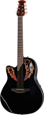 De Ovation Celebrity Elite CE44L-5-G is een linkshandige Westerngitaar met een cutaway. Het bovenblad is gemaakt van massief sparrenhout en heeft multi-wood epaulet-klankgaten. De Lyrachord mid-depth body zorgt voor een gebalanceerde klank. De hals is gemaakt van nato en de fretboard en brug zijn van ovangkol. De geoptimaliseerde X-bracing en het afgeronde C-halsprofiel zorgen voor een comfortabele speelervaring. De nieuwe kopplaathoek en overgang tussen hals en kop dragen bij aan de stabiliteit van de gitaar. De CE44L-5-G heeft 20 frets en 24 frets op de hoge E-snaar, met een scale van 641 mm en een topkambreedte van 43 mm. De gitaar is uitgerust met een Ovation Slimline pickup en OP-4BT preamp met ingebouwd stemapparaat. De kleur van de gitaar is zwart hoogglans.