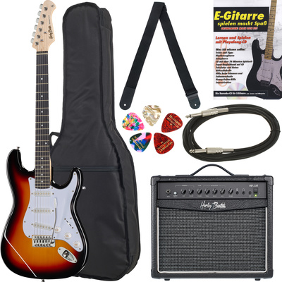 De Thomann Gitarren Set G2 Sunburst is een complete pakketdeal die bestaat uit een Harley Benton ST-20 SB Standard Series elektrische gitaar, een Harley Benton HB-20R gitaarcombo, een Thomann E-Guitar Gigbag Eco, een Thomann Nylonstrap, een the sssnake IPP1030 instrumentenkabel en een Harley Benton Guitar Pick Medium 5 Pack. De Harley Benton ST-20 SB Standard Series elektrische gitaar heeft een linde body, een geschroefde esdoorn hals, een sapeli fretboard met moderne “C” halsprofiel en 22 frets met dots inlays. De gitaar heeft een scale van 648 mm, een topkambreedte van 42 mm en een double-action truss rod. De pickups zijn 3 ST-style single coils en er zijn 1 volume en 2 tone controls en een 5-standenschakelaar. De hardware is chroom en er is een gesynchroniseerd tremolosysteem en die-cast stemmechanieken. De voorgemonteerde snaren hebben een dikte van .009 – .042 en de kleur is 3-Tone Sunburst Hoogglans. De bijpassende koffers zijn art. #122213# en art. #136377# (beide niet bij de levering inbegrepen).